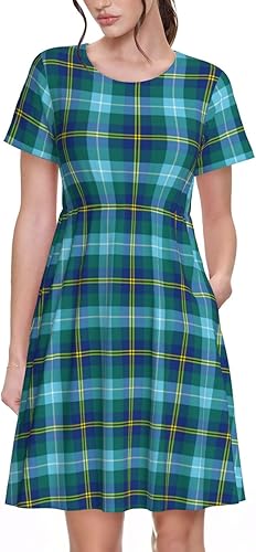 Scottish-Stewart-Tartan-Blue-White-Green-Red-Yellow Women's Short Sleeved Round Neck Wedding Dress for Guests