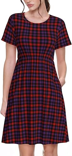 Red-Black-Tartan Women's Short Sleeved Round Neck Wedding Dress for Guests