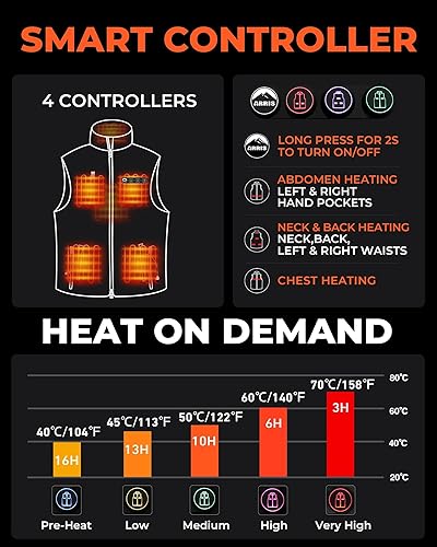 ✅ ??? ???-???? ??????????? ??????? ???? ????? ??????? - 8 independent heating zones (chest, abdomen, back, neck, waist) with 4 control buttons. Powered by a 20,000mAh UL-certified battery, this womens battery puffer heated vest heats up to 140°F in 5 seconds and lasts up to 12 hours. The USB Type-C port also allows for easy charging of your smartphone.