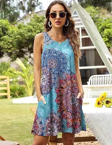 Summer Dresses for Women 2025 Casual Sleeveless Sundresses Tank Dress Mini Loose Beach Cover Up with Pockets(Print1,Small)