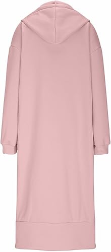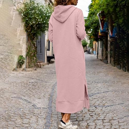 Women Hoodies Maxi Dress Long Sleeve Drawstring Slit Casual Loose Hooded Sweatshirt Fall Solid Dresses with Pocket(Pink,Small)