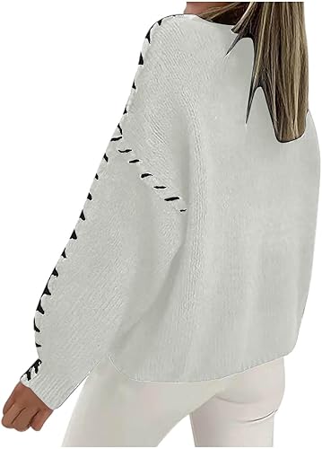 Women's Contrast Binding Drop Shoulder Sweater, Casual Loose Long Sleeve Round Neck Pullover Knitwear Tops Clothes(White,Large)