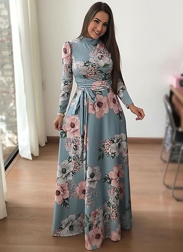 Womens Floral Print Maxi Dress Bohemian Casual Pleated Long Dresses with Belt(Green,X-Large)